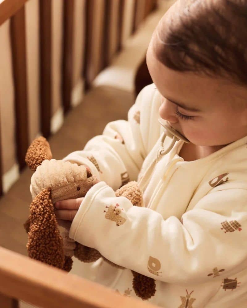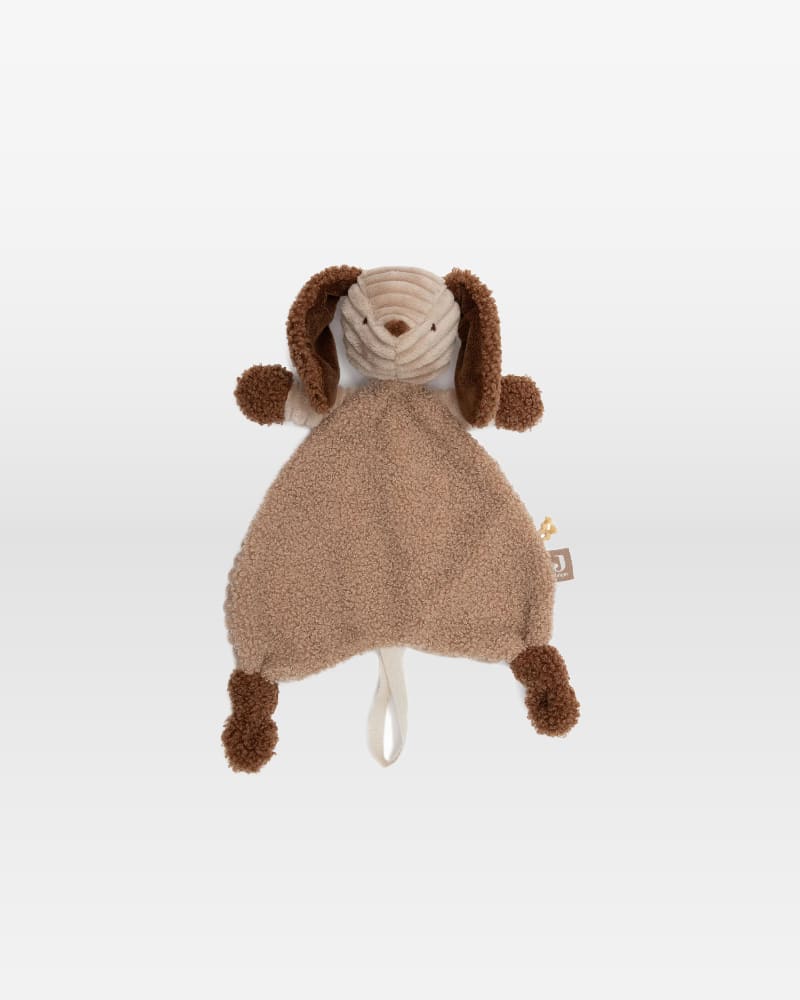 Dit schattige speendoekje uit de Animal Friends-collectie van Jollein heeft de vorm van een lief hondje genaamd Diego. Het is gemaakt van zachte ribstof in een warme biscuitkleur, gecombineerd met bouclé details in leather brown voor de oortjes, handjes en voetjes. Dankzij het handige koordje kun je het doekje eenvoudig aan een speen bevestigen, zodat je kleintje het altijd dichtbij heeft. Maak het extra persoonlijk om de naam van het kindje er op te laten borduren