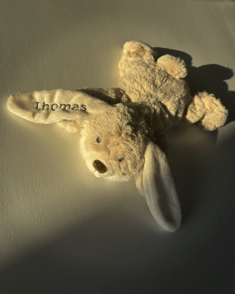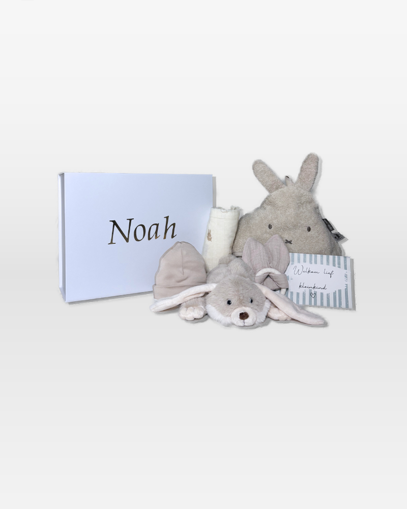 Maak het kraamcadeau nog persoonlijker door de naam van het kindje op de zachte konijnenknuffel te laten borduren. Dit doen we met een standaard lettertype in de kleur bruin, zodat het een mooi geheel is dat goed bij elkaar past. Ook op de luxe magneetdoos komt de naam van het kleinkind te staan en er wordt een lief kaartje toegevoegd met een handgeschreven boodschap. Alles wordt met zorg geregeld en mooi verpakt, zodat het kraamcadeau helemaal klaar is om te geven en er zelf niets meer gedaan hoeft te worden.